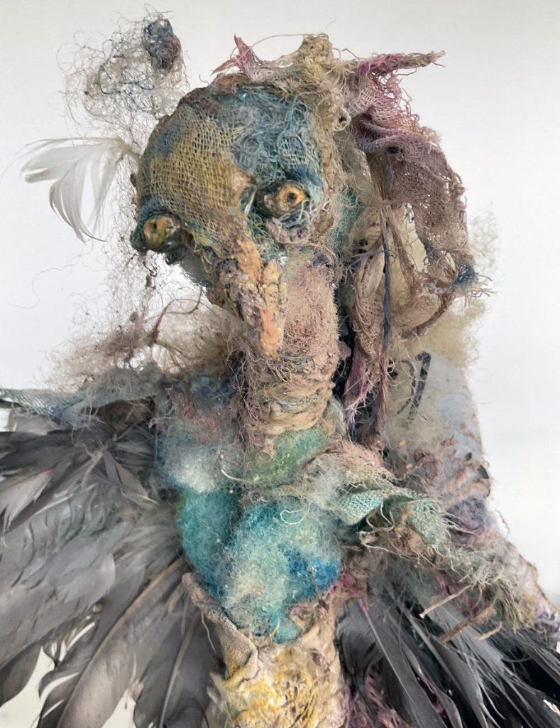 Winged (2024) bird wings wood branches muslin clay plaster wool assorted materials debris soft pastel glue – width 30cms height 54cms diameter 74cms A winged mythical creature emerges from the earth precarious, about to take flight. Physically and psychically teetering Winged personifies vulnerability and robustness.